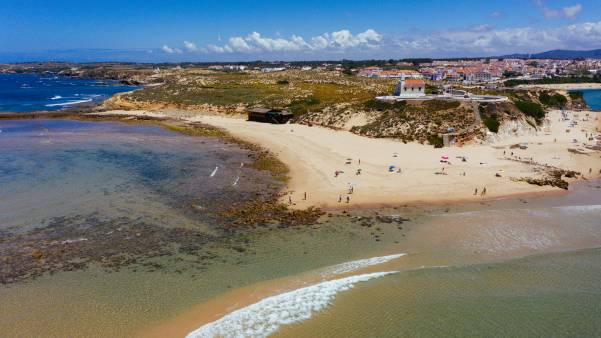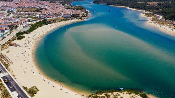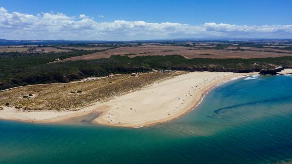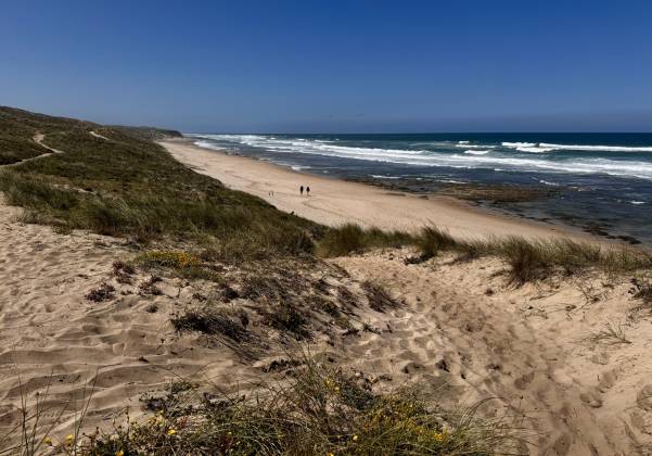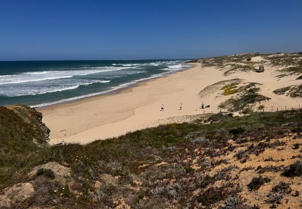 Praia junto à foz do rio Mira com vista para a histórica vila de Milfontes…